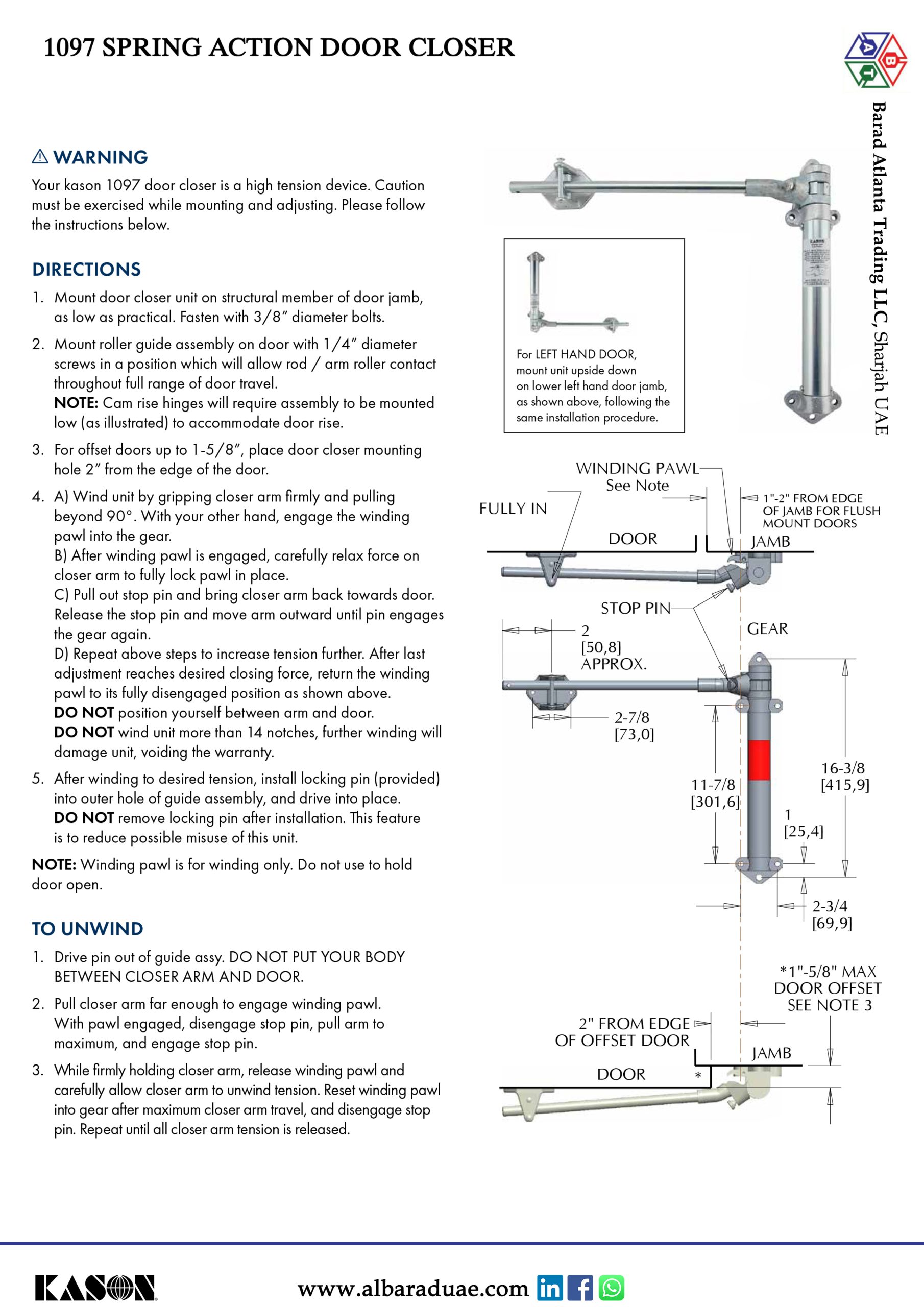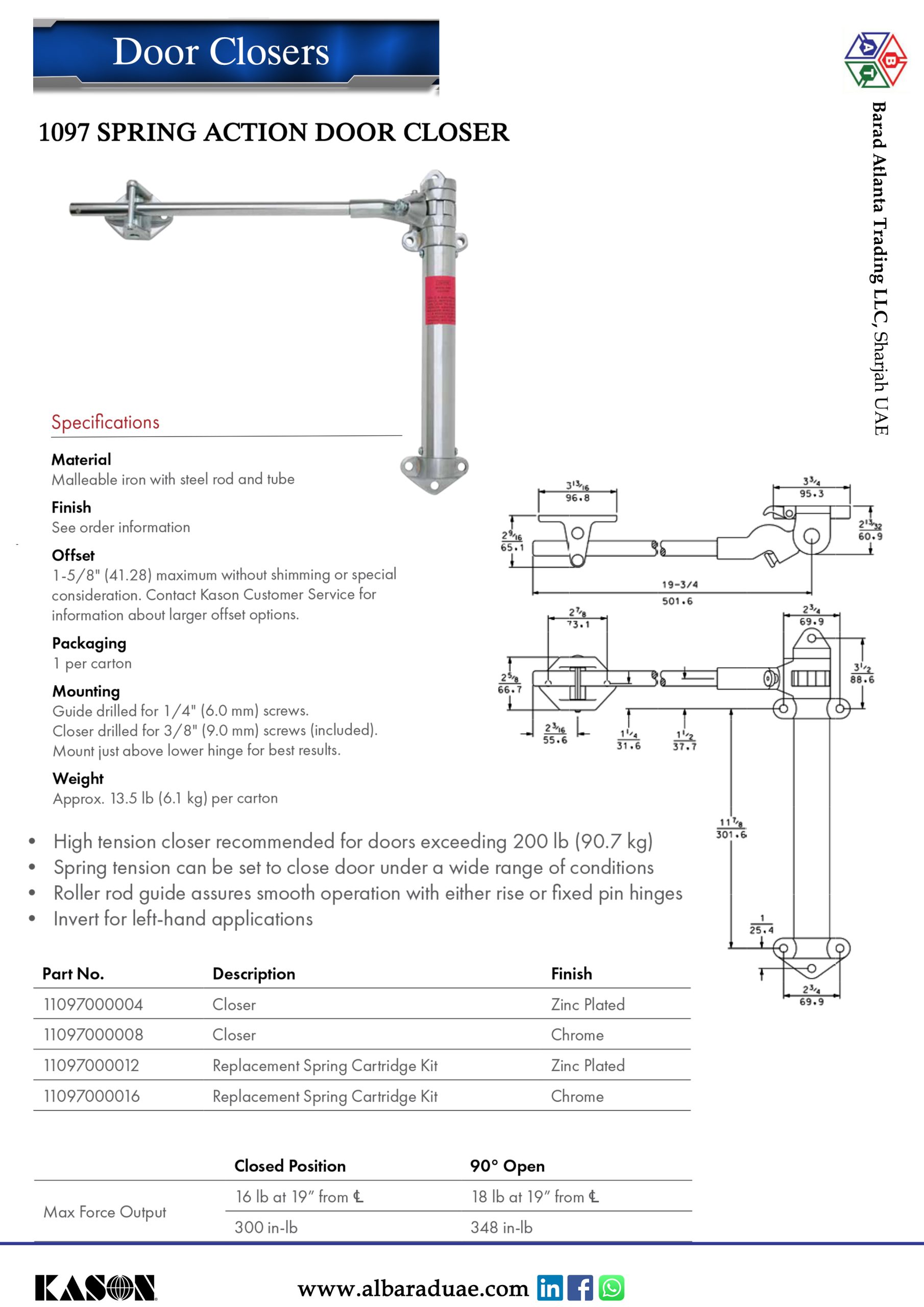 High tension closer recommended for doors exceeding 200 lb (90.7 kg) , Malleable iron with steel rod and tube , Zinc Plated Part No. 1097000004