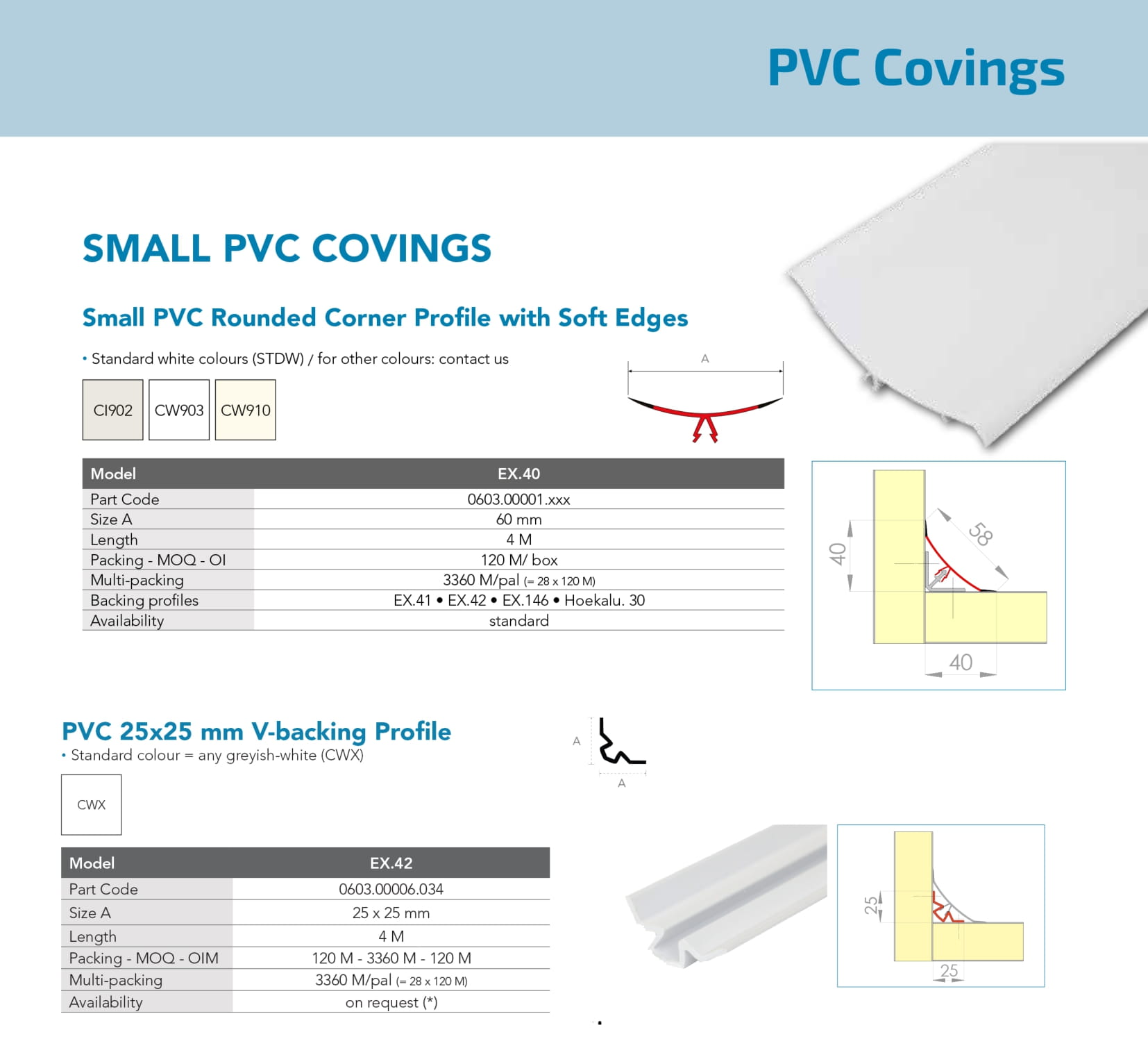 Part No. EX40-9010 Rounded  Corner Small-4 Mtr Long & EX42-9010 Backing Profile PVC 25X25 -4 Mtr Long